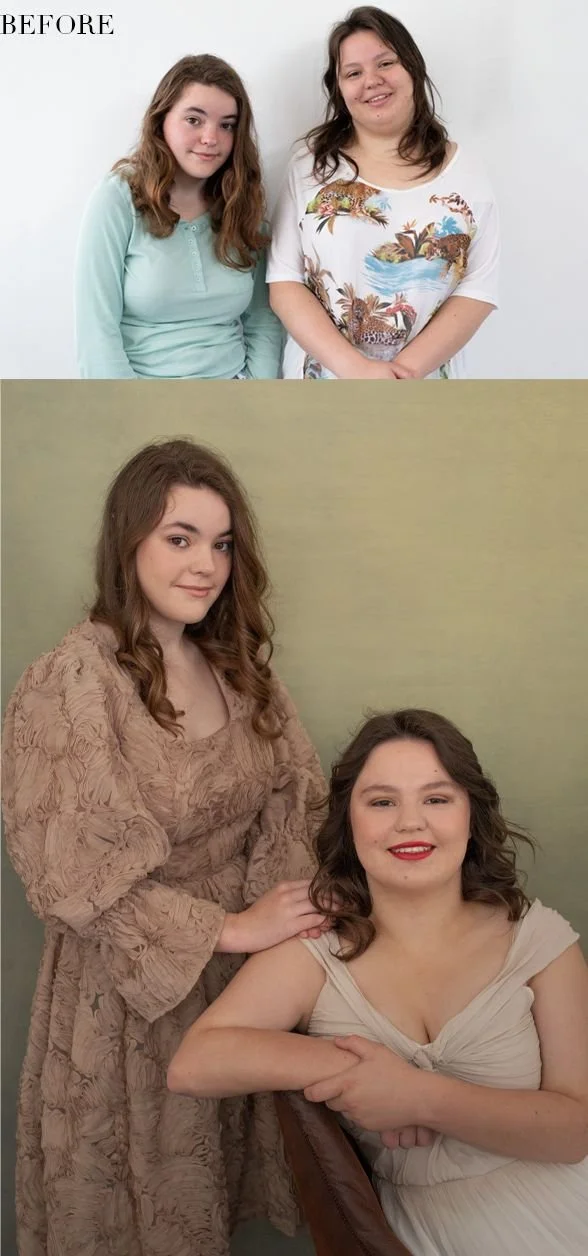 To celebrate Melissa's 18th and Rhiannon's 16th birthday we captured two casual and one dressy look. And don't they just shine on the amazing green-gold-vintage canvas background? With one in her own ball gown and the other in one from our studio wardrobe.