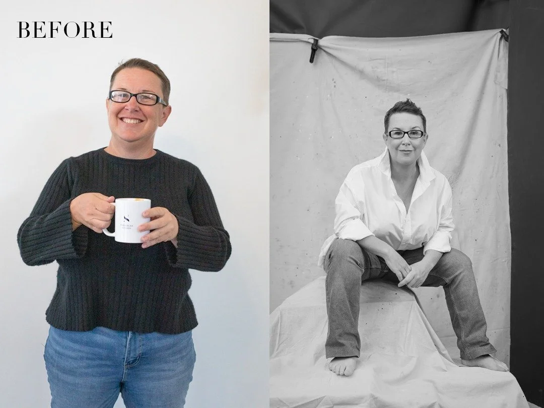 At her styling consultation we chatted about how she wanted to see herself and what she wanted to wear. As someone who lives in jeans, that was a definite, then it was the funky fashion inspired collard shirts and business blazers. And we teamed that laid-back semi-casual look with an artistic painters drop sheet as a backdrop.