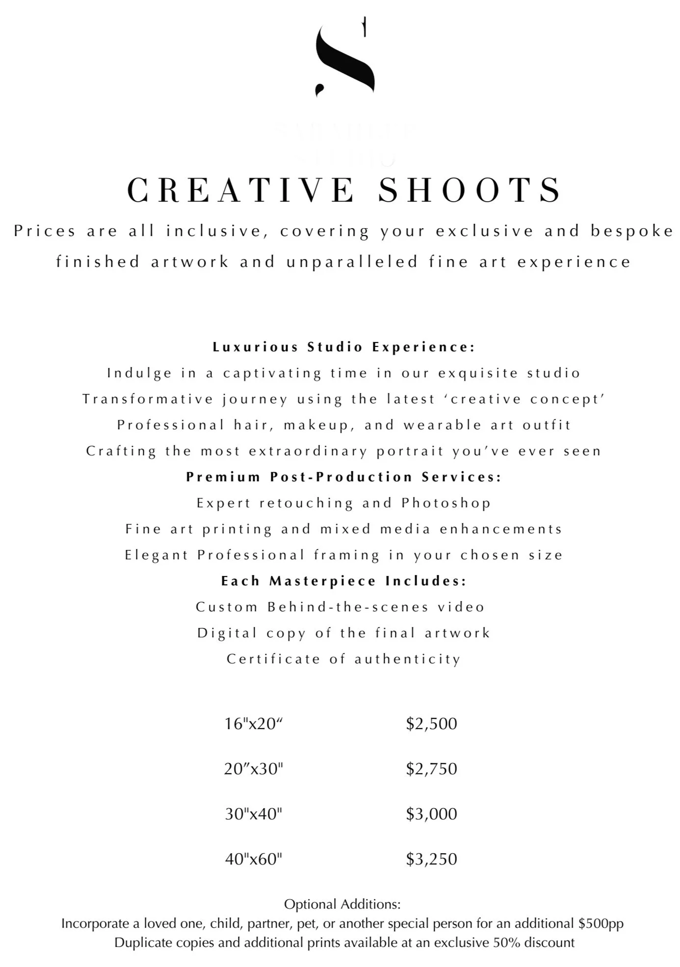 Our Limited Edition shoots start at just $2,500, with a 50% deposit required to secure your booking. Your package includes everything: retouching, fine art printing, mixed media enhancements, and professional framing of your chosen portrait - guaranteed to last a lifetime.